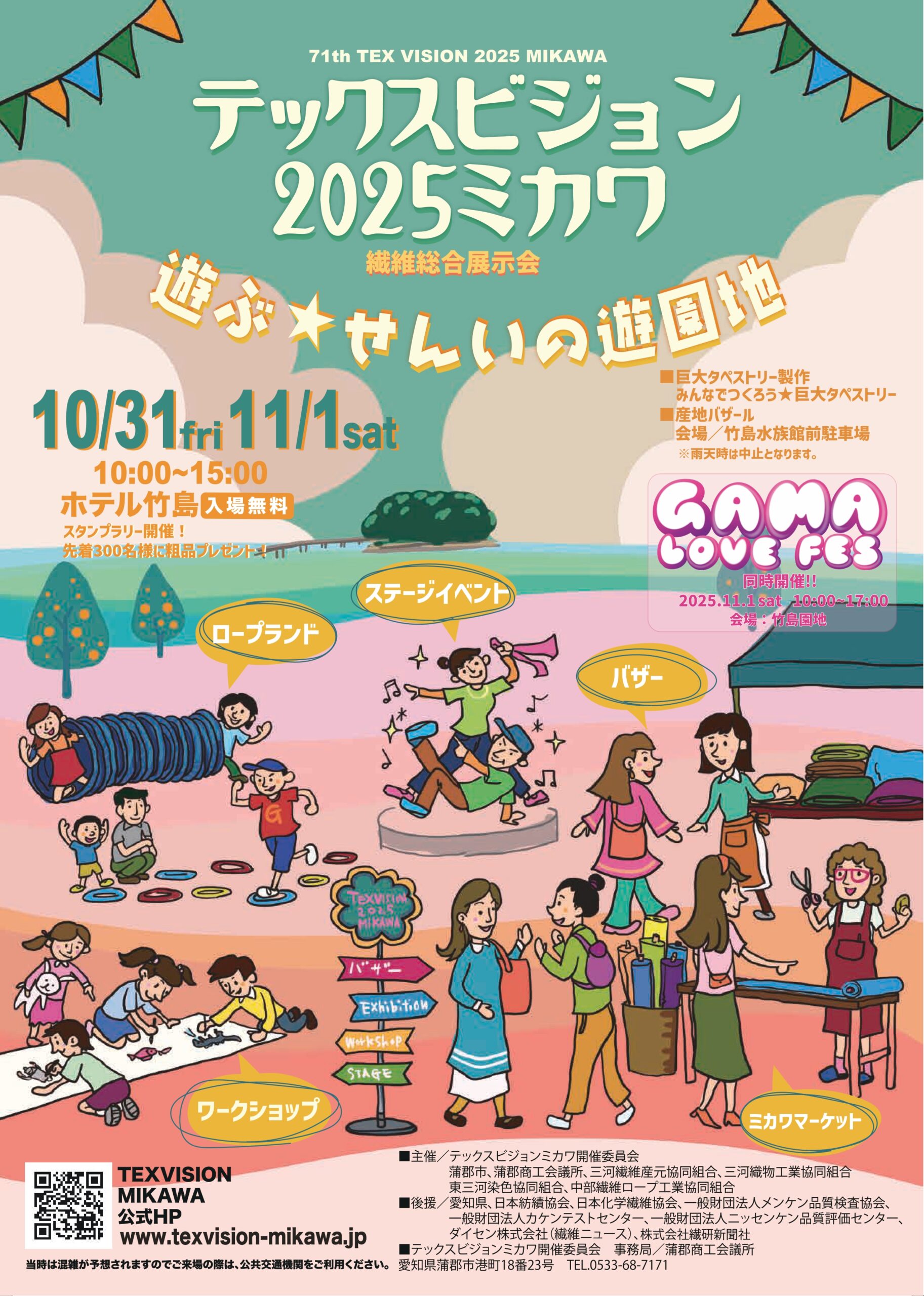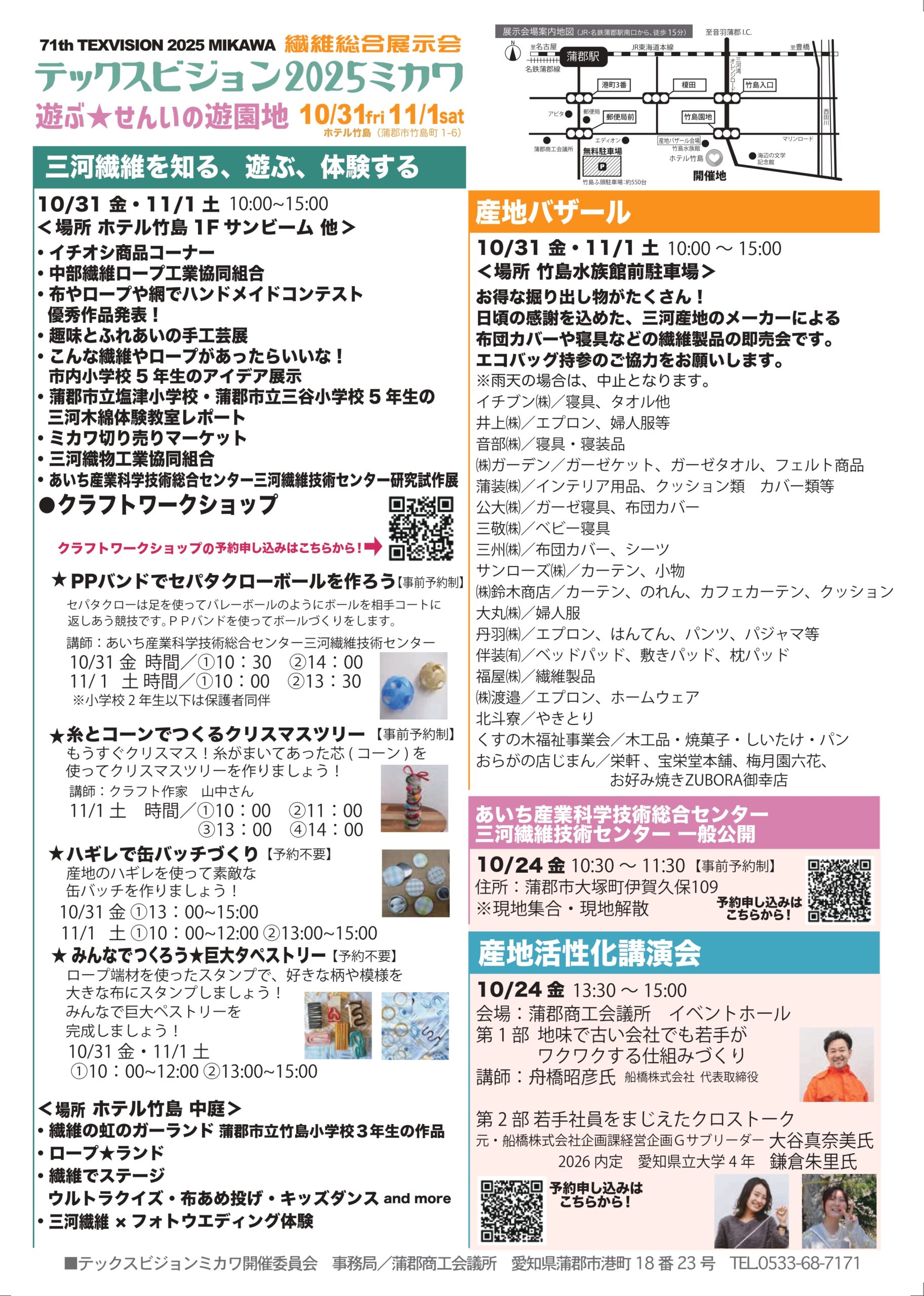 テックスビジョン2025ミカワのチラシが完成。みなさまには大変長らくお待たせいたしました。2日間のプログラムの全容がこちらからご覧いただけます。もりだくさんの2日間、ぜひ皆様お誘いあわせてお楽しみください。PDFダウンロードは下記からどうぞ✨