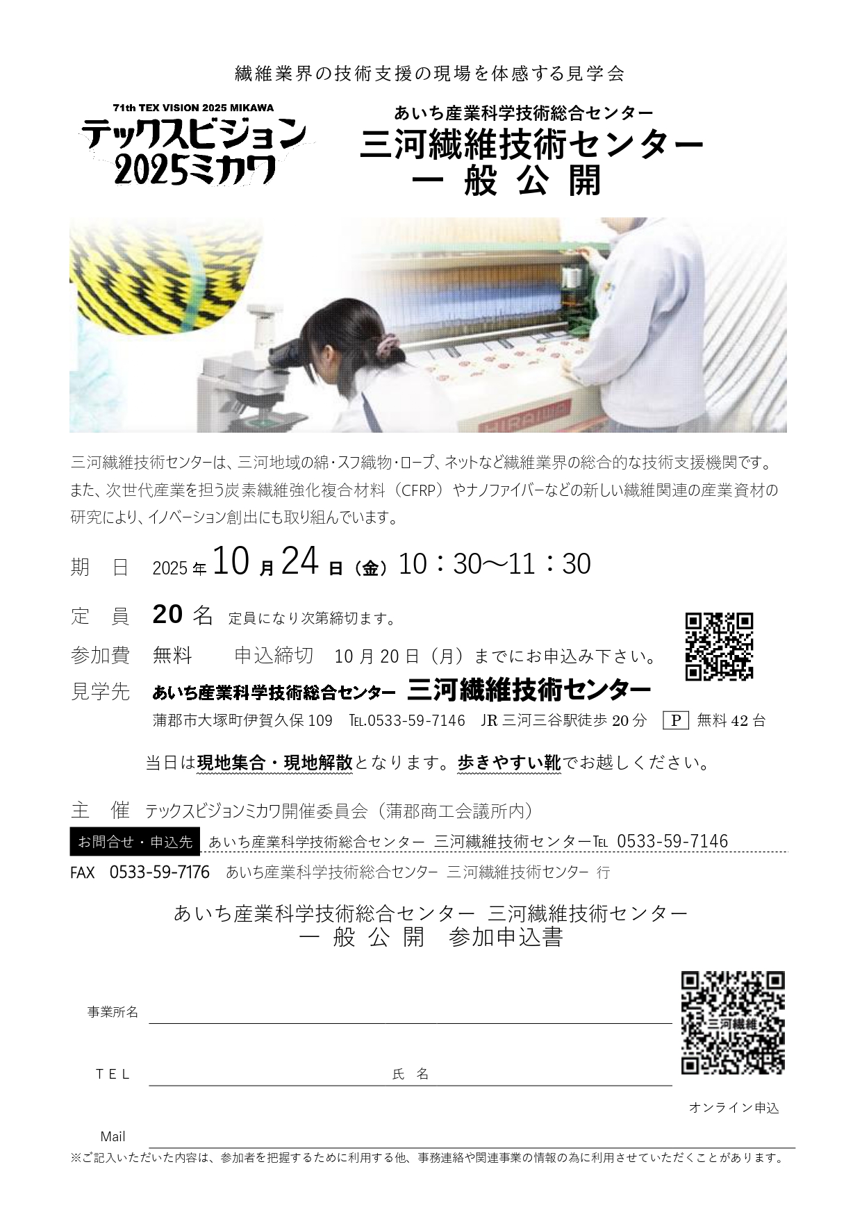 テックスビジョンミカワに関連して、通常は公開されていない三河繊維技術センターが一般公開されます。最先端の繊維関連技術にぜひ触れてみませんか?定員がございますのでお申し込みはお早めにぜひどうぞ!